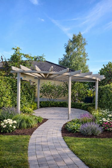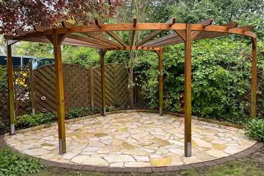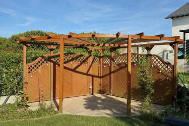 Die Stern-Pergola aus Douglasienholz ist ein besonderes Gestaltungselement für Garten und Terrasse. Durch ihre markante Form wird sie schnell zum Mittelpunkt des Außenbereichs und verleiht jeder Gartenecke einen individuellen Charakter.